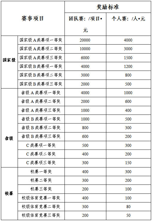 注:体育类比赛的第一、二名为一等奖,第三、四、五名为二等奖,其他名次为三等奖。