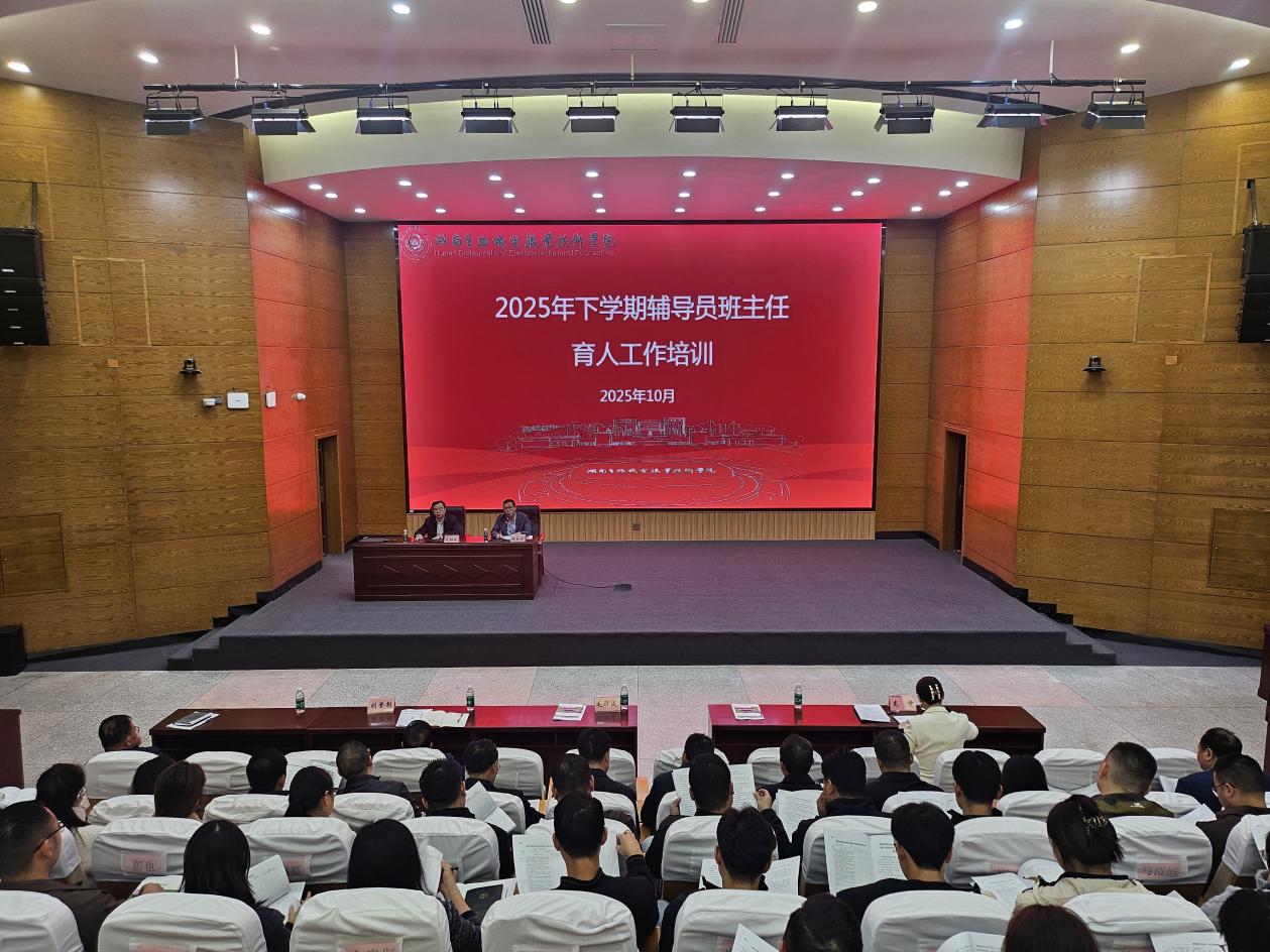 为深入学习贯彻党的教育方针,落实立德树人根本任务,提升辅导员班主任队伍的育人能力和专业素养,明确辅导员班主任工作的重点与方向,10月21日下午,学校在知新楼316报告厅召开2025年下学期全校辅导员班主任育人工作培训会。学校党委书记毛祥成出席并讲话,党委委员、副校长廖良林主持会议并做工作报告。学生工作部、校团委、宣传统战部全体人员,各二级学院党总支书记、副书记及全体辅导员班主任参加了会议。