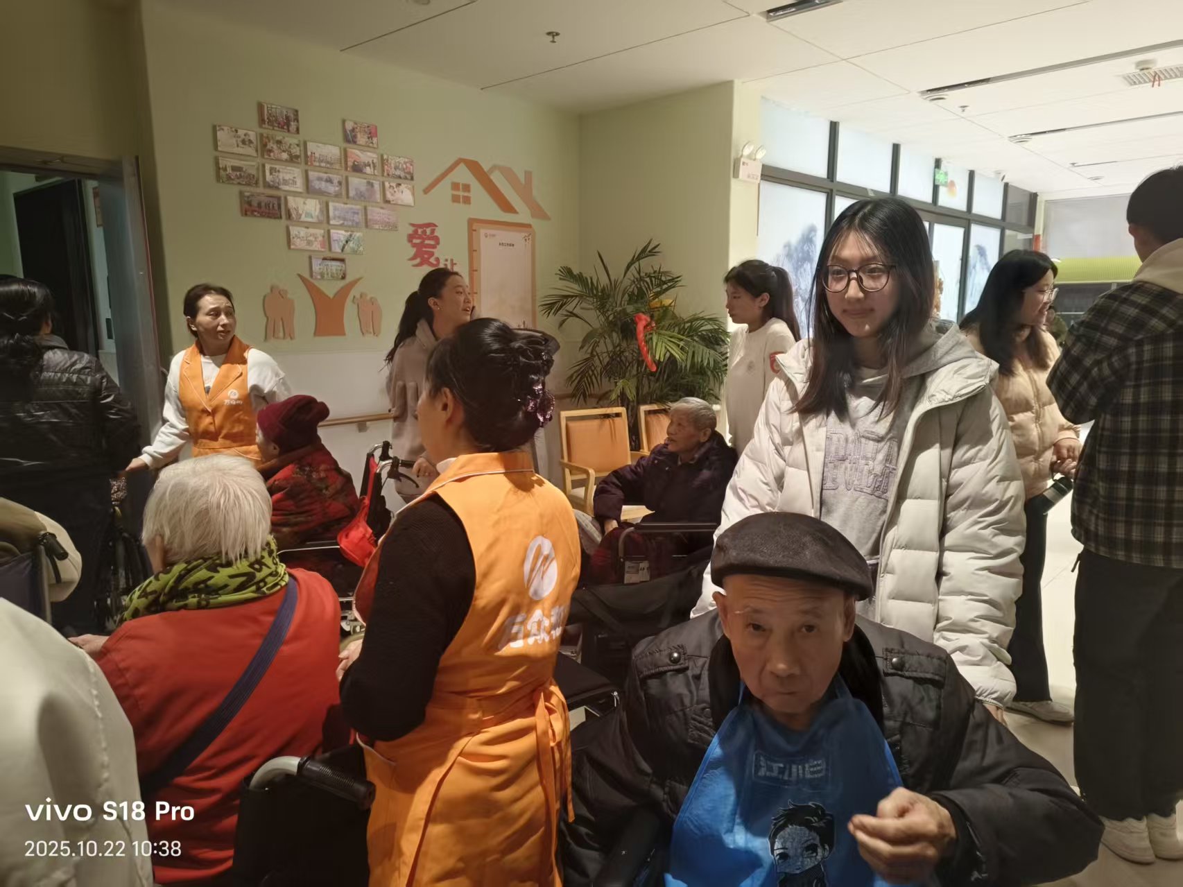 上午九时,养老院的活动室里座无虚席,同学们用优美的舞姿、动听的歌声将整场演出推向高潮,整个活动掌声、笑声、喝彩声此起彼伏,活动现场化作一片欢乐的海洋。