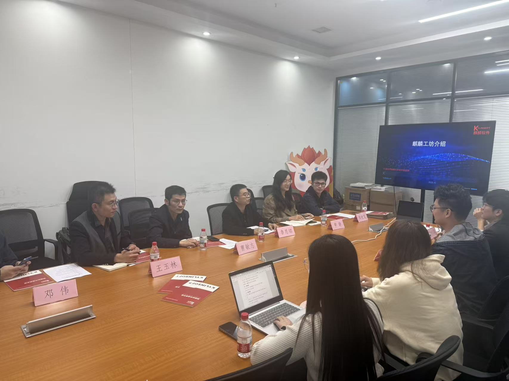 调研首站抵达麒麟软件有限公司,在企业负责人陪同下,团队参观了公司展览厅,全面了解企业发展历程、核心技术研发成果及公司在国产信创领域的关键设备和应用场景。随后的座谈交流中,双方围绕行业前沿动态、企业岗位需求、技能培养重点等议题深入探讨。企业方详细分享了人才招聘标准与实践能力要求,校方介绍了教研室人才培养模式与课程体系设置,双方就共建实践基地等达成初步合作共识。