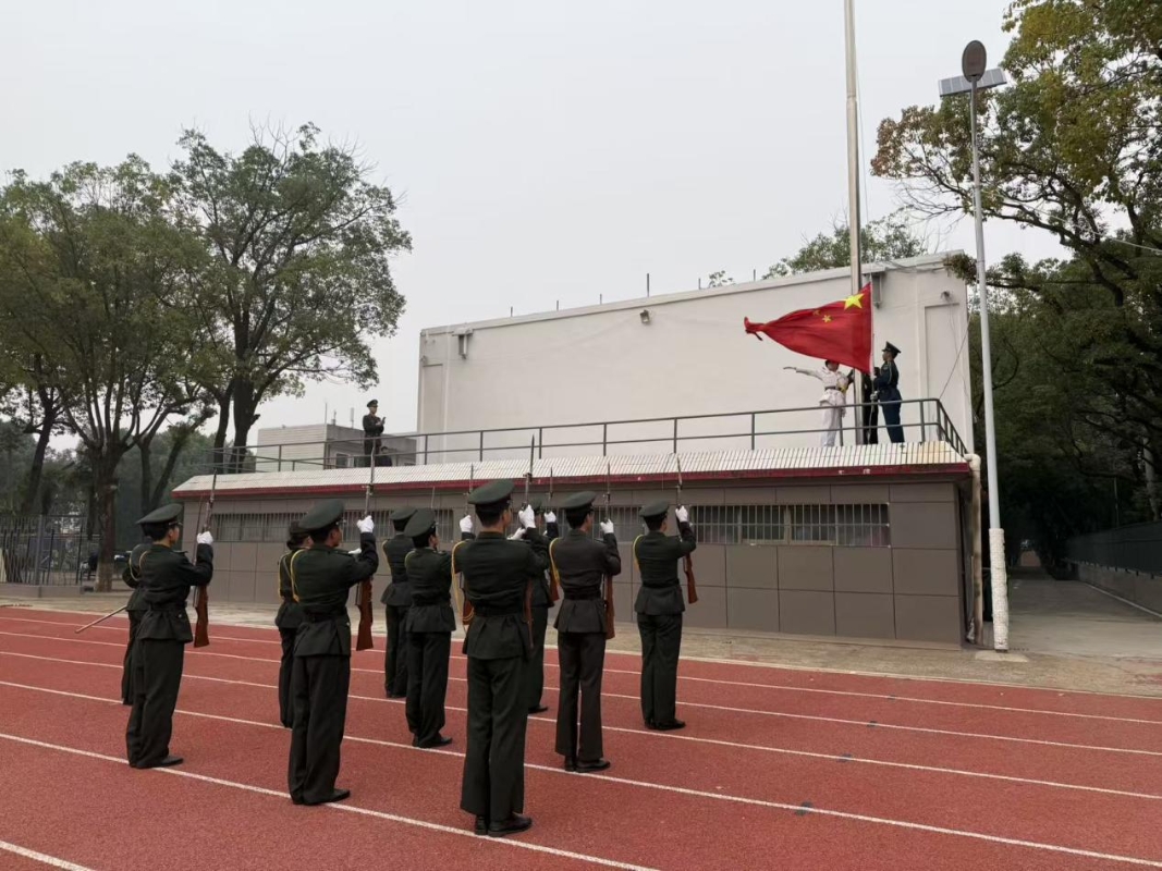 "齐步——走!"口令响起,护旗手迈着整齐步伐护送国旗至旗杆。《义勇军进行曲》奏响,五星红旗冉冉升起,全体师生肃立行注目礼,爱国情怀激荡全场。