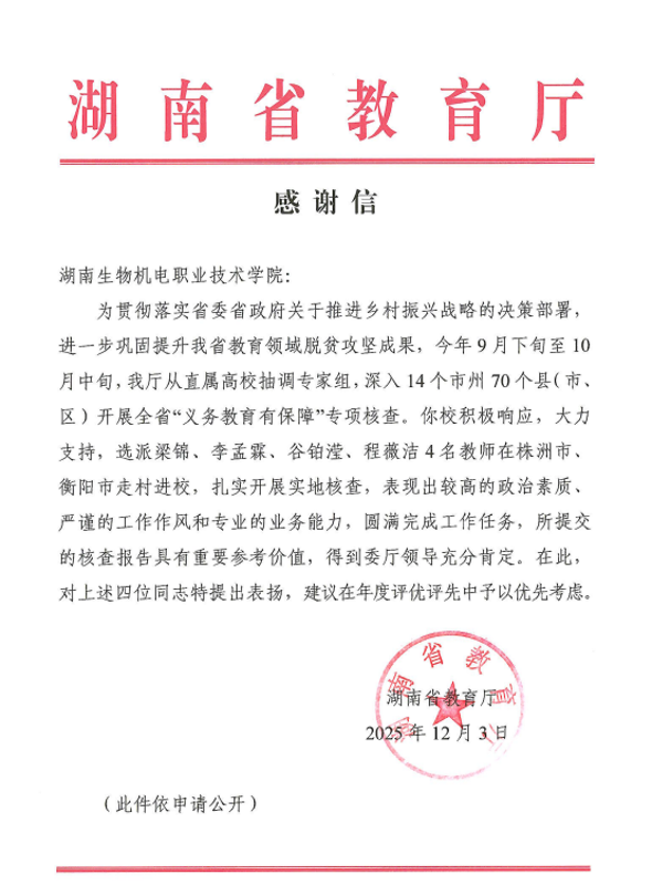 近日,我校收到湖南省教育厅发来的感谢信,对我校选派参与全省 "义务教育有保障" 专项核查的马克思主义学院4名教师梁锦、李孟霖、谷铂滢、程薇洁予以高度肯定。