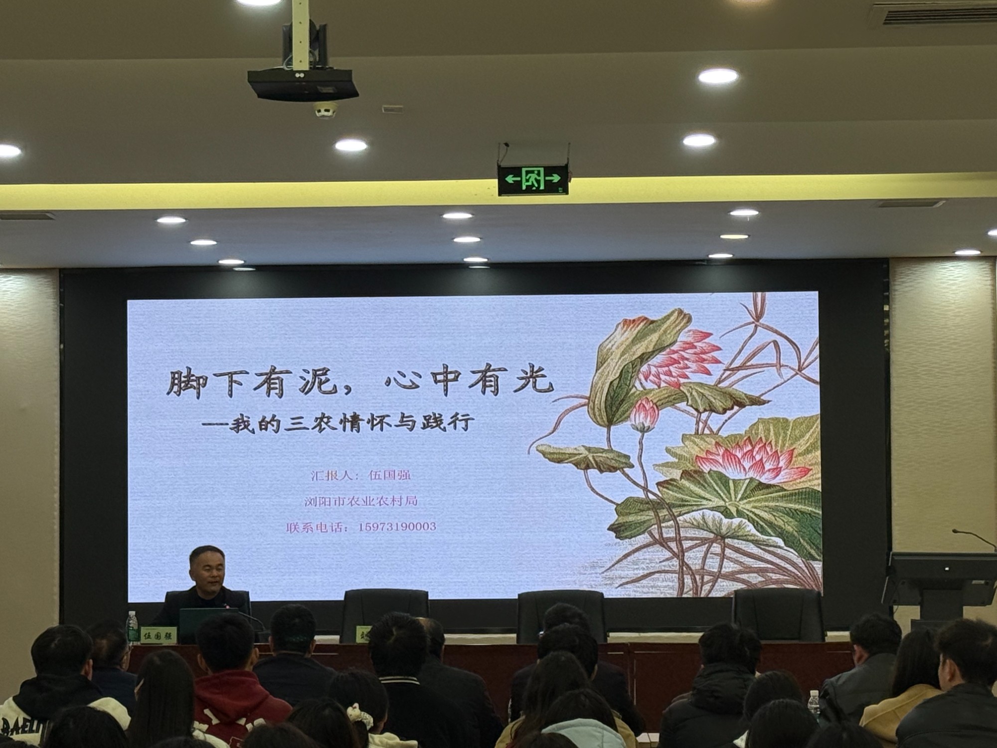 为深入学习贯彻习近平总书记关于教育的重要论述,大力弘扬教育家精神,营造尊师重教社会风尚,凝聚教育强国建设合力,动物科技学院于2025年12月10日特邀“全国先进工作者”、资深农业技术推广专家伍国强研究员,作客“牧教薪传”教育家精神系列讲座。本次讲座的主题为“脚下有泥,心中有光——我的三农情怀与践行”,学校党委委员、副校长刘登魁主持,学校人事处(教师工作部)处长王少华、动物科技学院全体教师及学生代表共同聆听。
