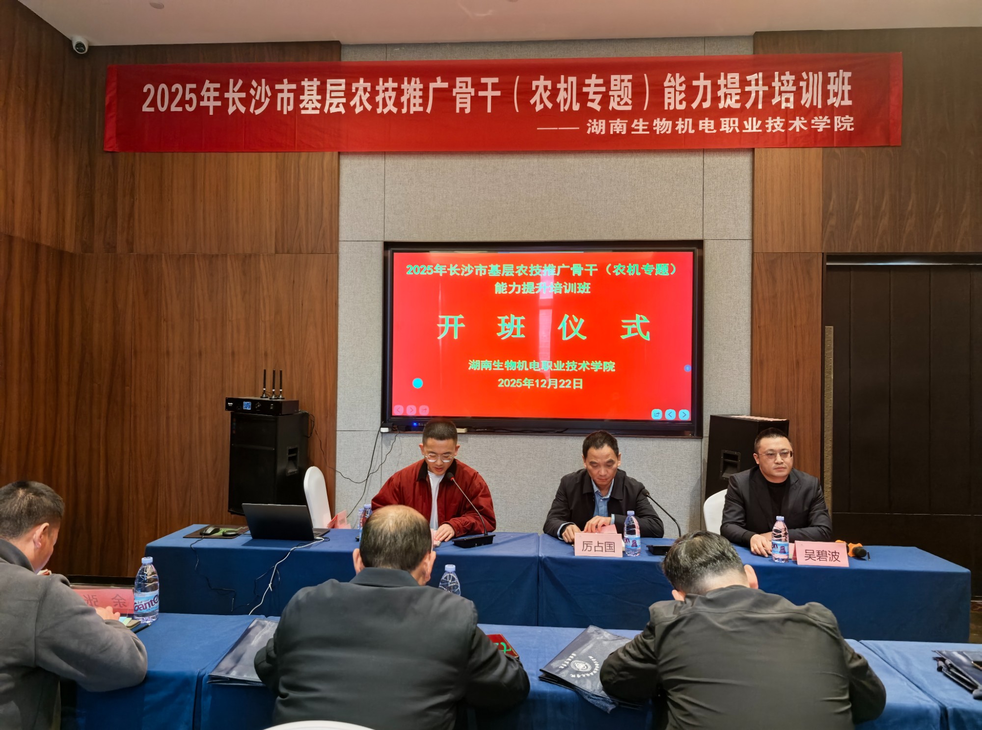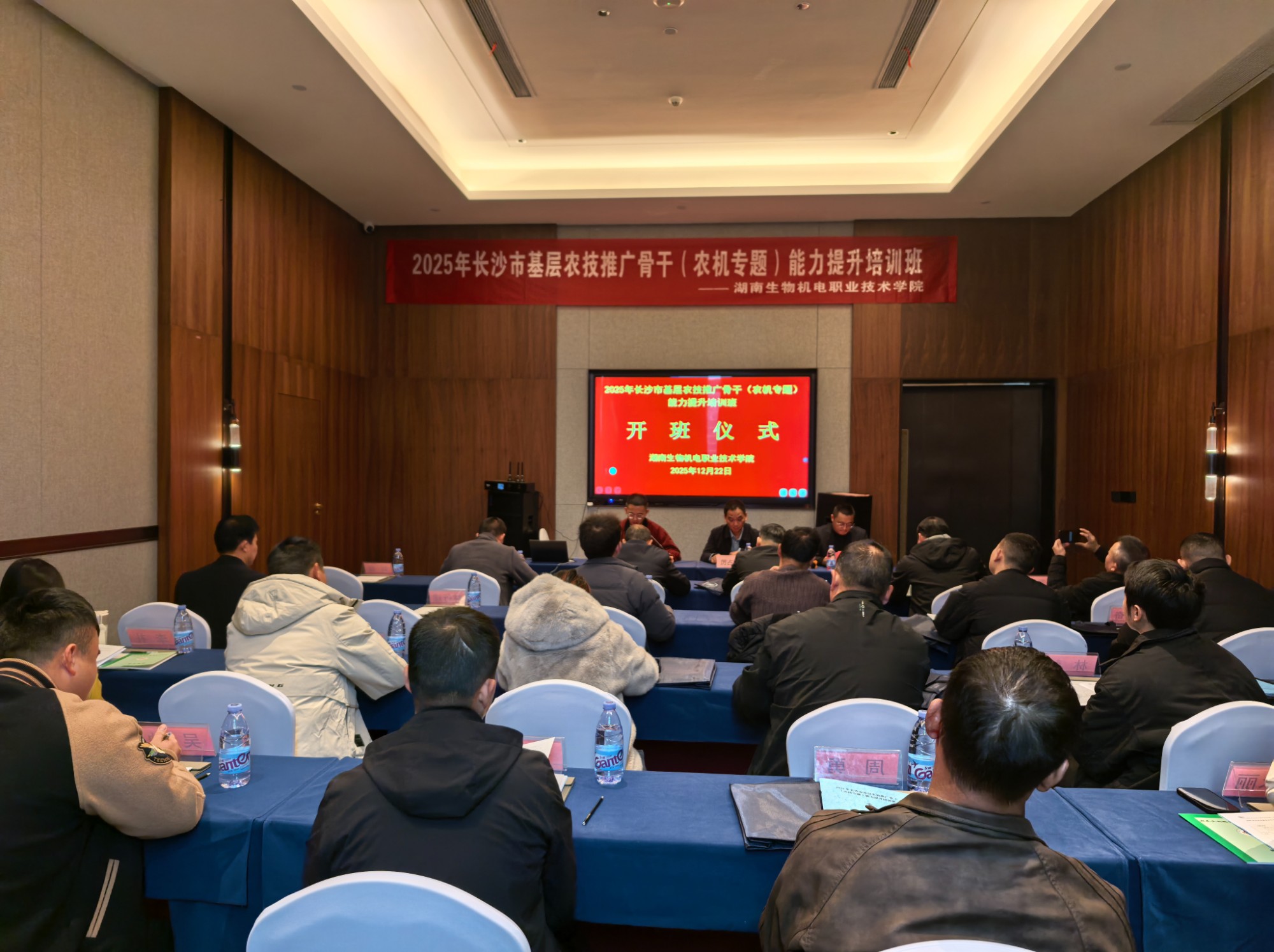 层林尽染、万类霜天竞自由的孟冬时节。12月22日,由湖南生物机电职业技术学院承办的2025年长沙市基层农技推广骨干(农机专题)能力提升培训班在学校校外培训基地举办。长沙市农业农村局科技教育处处长厉占国、学校继续教育学院培训科科长吴碧波以及来自望城区、浏阳市、长沙县的31名基层农技推广骨干参加了开班仪式。开班仪式由学校继续教育学院农艺师张旭锋主持。